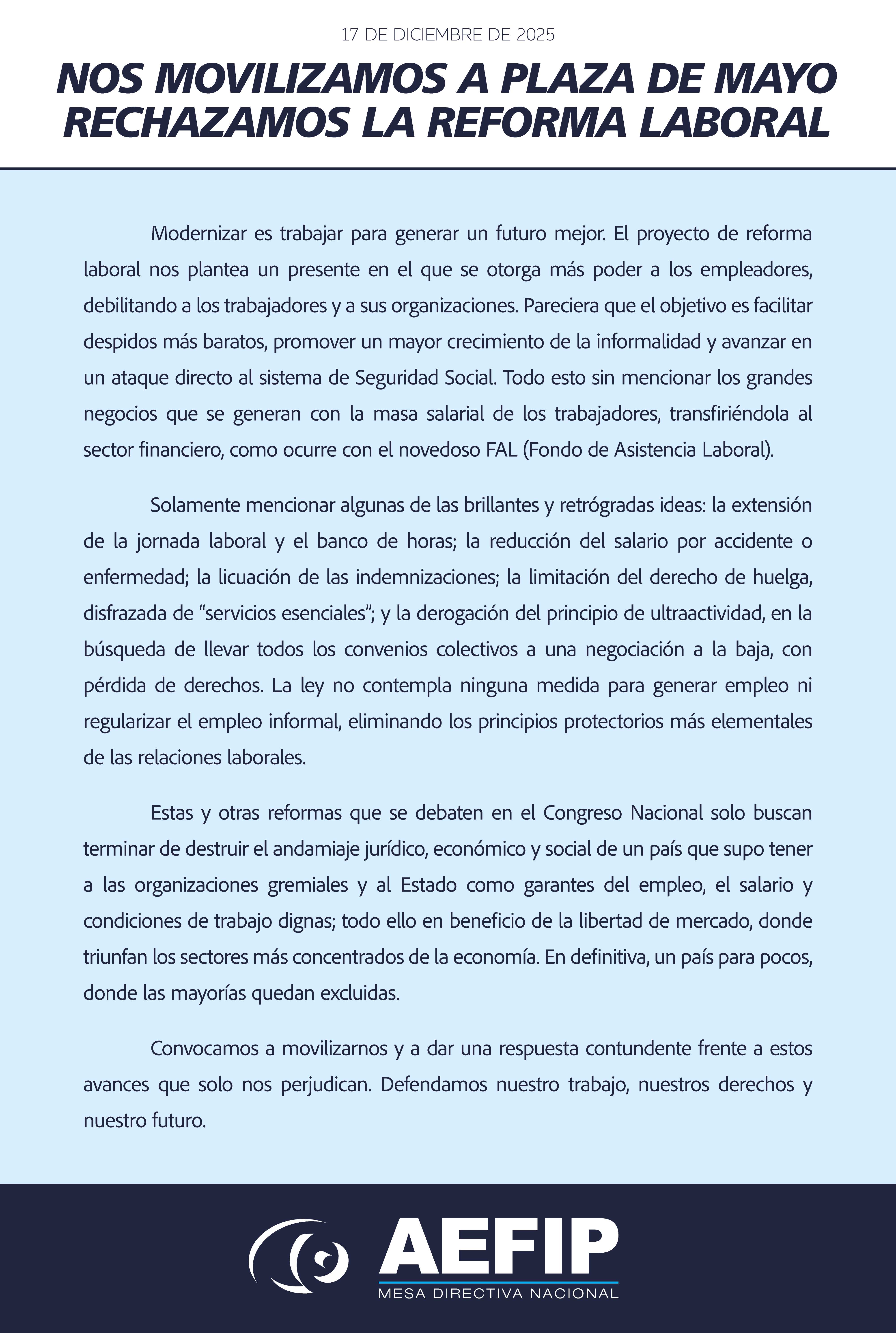 Nos movilizamos a plaza de mayo rechazamos la reforma laboral