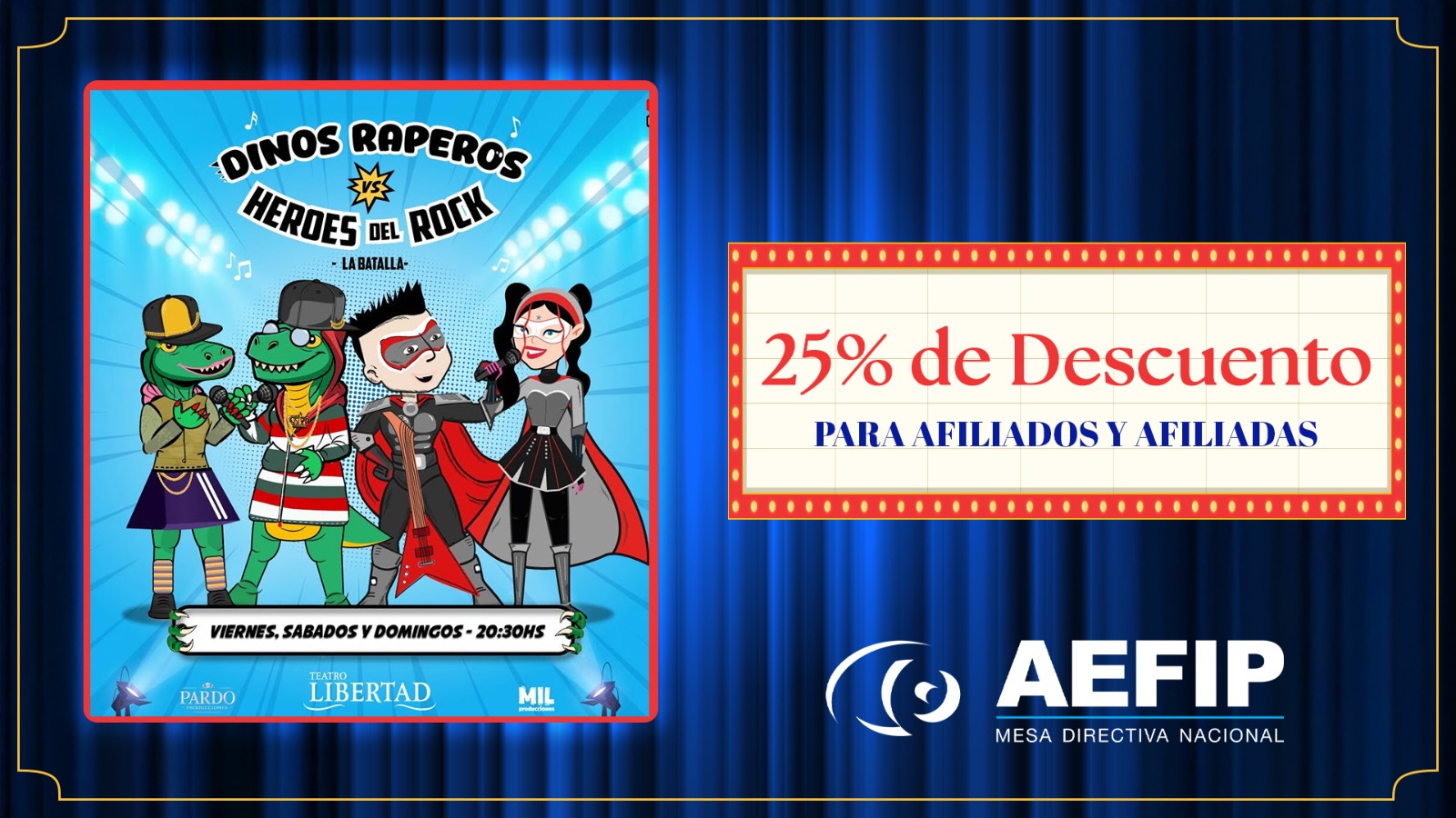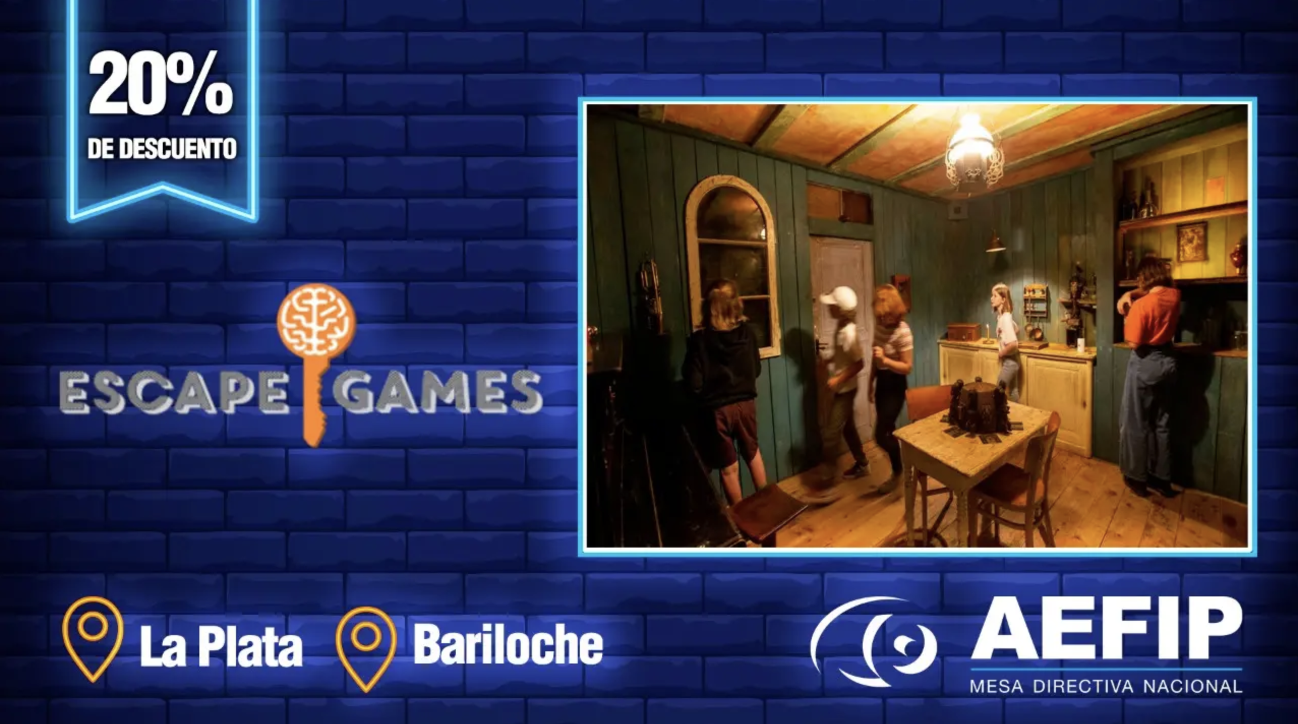 Por ser afiliada o afiliado a AEFIP tenes un 20% de DESCUENTO en las salas de escape; haciéndose extensivo el mismo para el festejo de cumpleaños. No se acumulan los descuentos, beneficios y promociones que los locales otorguen al público en general.