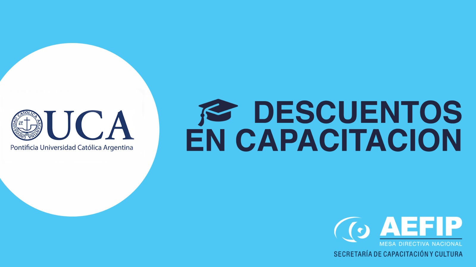 La Mesa Directiva Nacional de AEFIP renovó el convenio con la reconocida “Universidad Católica Argentina - UCA” acercándole de esta manera descuentos a los afiliados y afiliadas que quieran concurrir a dicha Institución con el objetivo de formarse y capacitarse como profesionales.