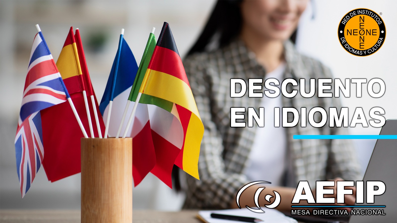 De esta forma, todas las afiliadas y afiliados a AEFIP obtienen un descuento del 100% de descuento en la Matricula 15 % sobre las cuotas mensuales de cursos grupales, presenciales y online en todos los idiomas que se enseñen y estén en la oferta educativa vigente.