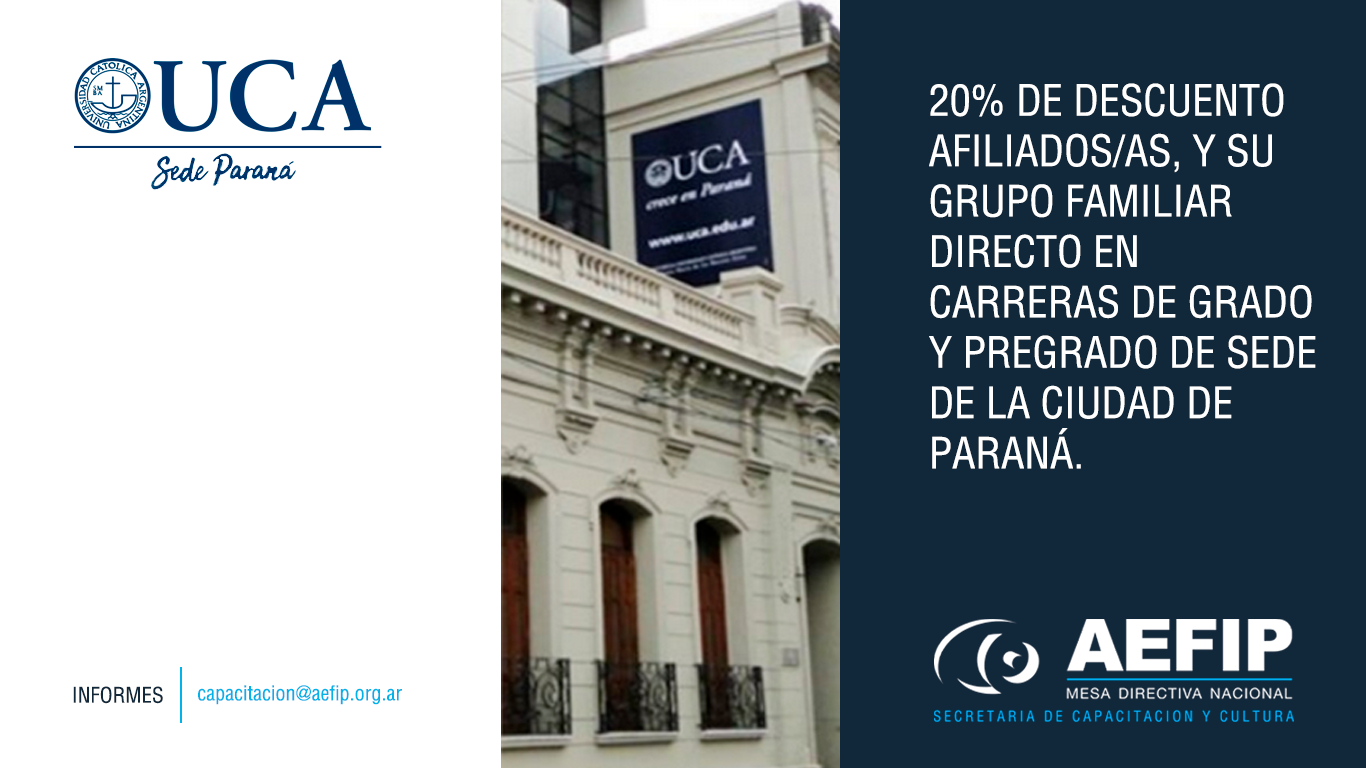 LA UNIVERSIDAD CATÓLICA ARGENTINA (SEDE PARANA) a través de la Facultad Teresa de Ávila brinda un 20% de descuento a nuestros afiliados/as, y su grupo familiar directo en su oferta educativa de carreras de grado y pregrado dictadas en la Facultad, en su sede de la Ciudad de Paraná.
