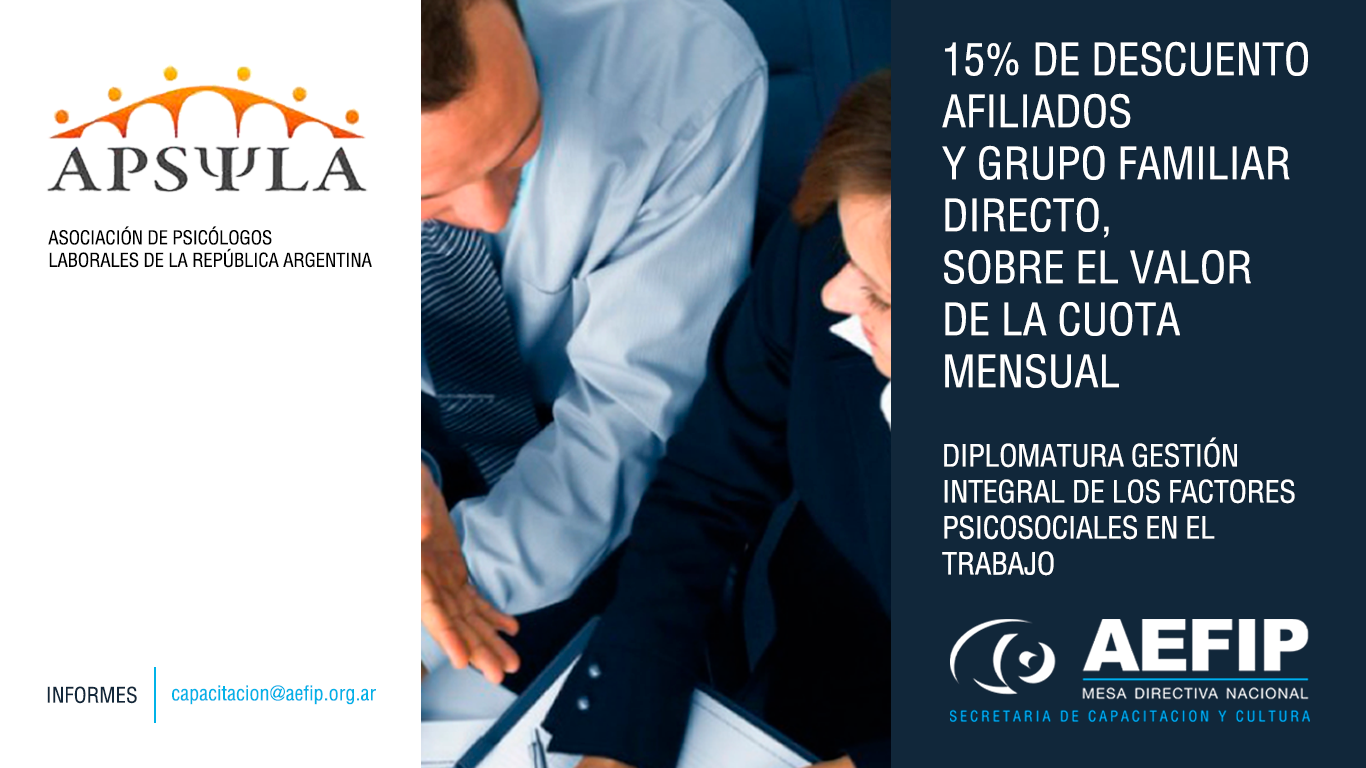 DIPLOMATURA: GESTIÓN INTEGRAL DE LOS FACTORES PSICOSOCIALES EN EL TRABAJO. Realizada en ASOCIACIÓN DE PSICÓLOGOS LABORALES DE LA REPÚBLICA ARGENTINA (APSILA)