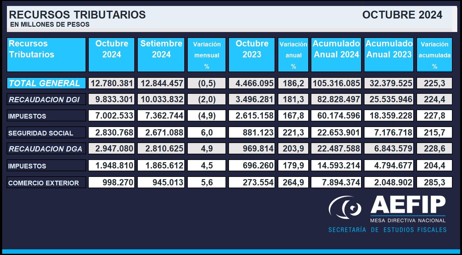 La recaudación tributaria ascendió en Octubre de 2024 a $ 12.780.381 millones (M), con un crecimiento del 186,2% interanual (i.a.). La recaudación de la DGI se incrementó un 181,3% y la de la DGA aumentó en un 203,9% i.a.