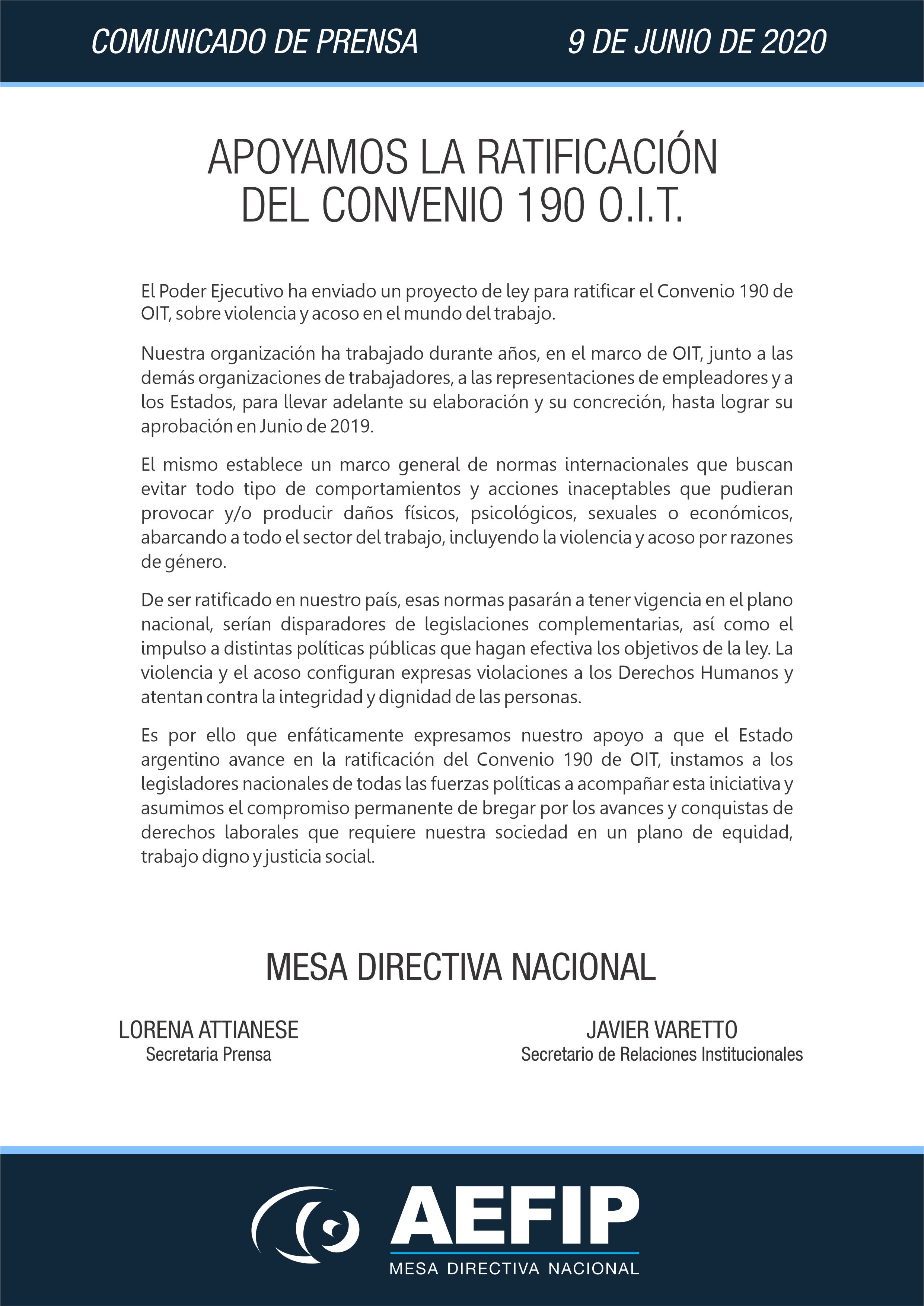 ES LEY LA RATIFICACION DEL CONVENIO 190 | Comunicado | 12/11/2020 | BOLETIN 12/11 | |