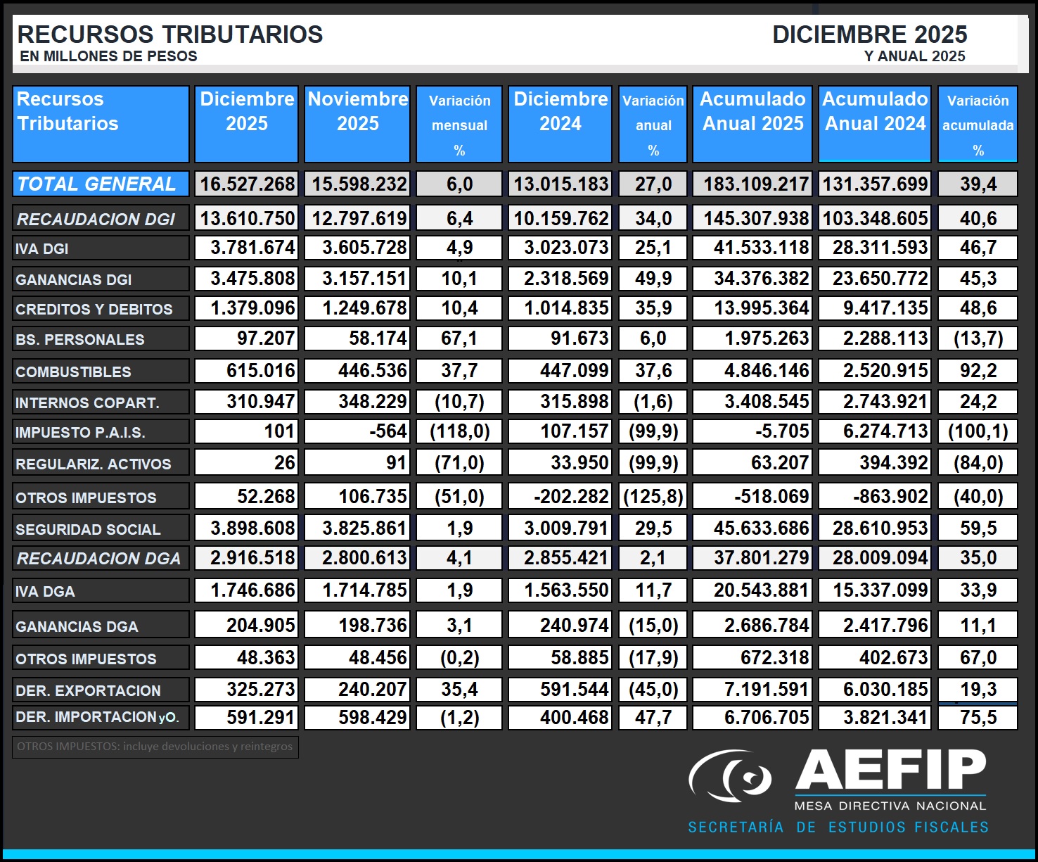 La recaudación tributaria de diciembre de 2025 fue de $16.527.268 millones, con una variación interanual (i.a.) de 27%. Los recursos de la DGI crecieron 34% i.a. y los de la DGA 2,1% i.a. En el acumulado anual, la recaudación total aumentó 39,4% respecto de 2024, con subas de 40,6% en la DGI y 35,0% en la DGA.