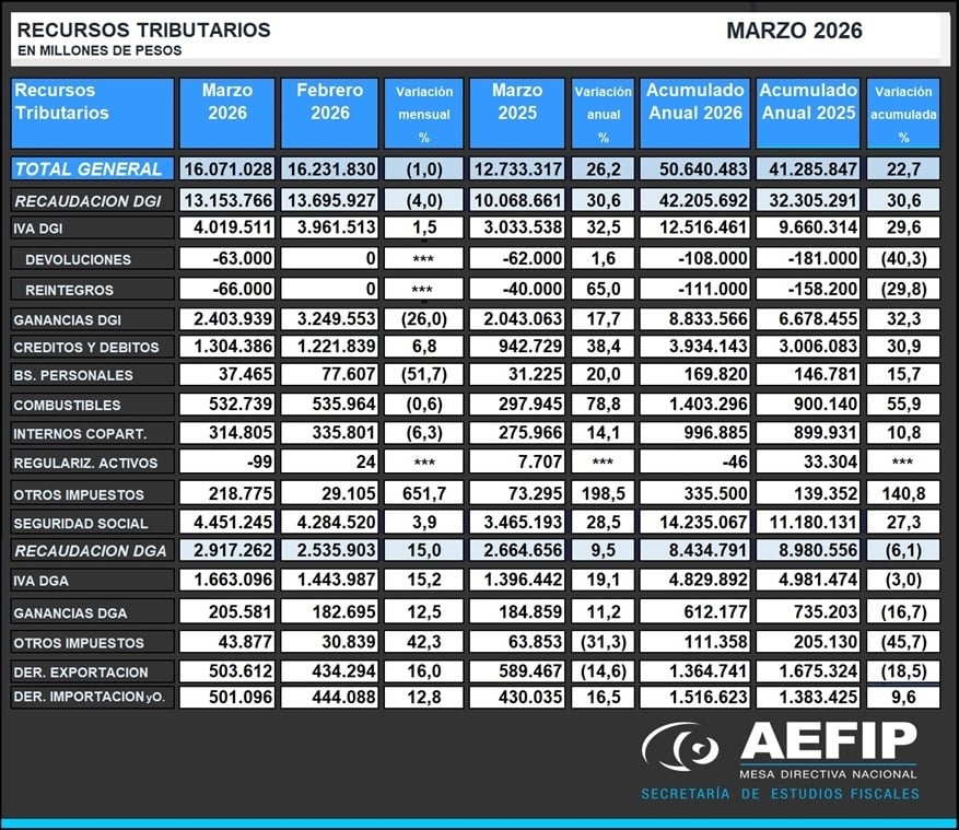 La recaudación tributaria ascendió en Marzo de 2026 a $ 16.071.028 millones (M), con un crecimiento del 26,2% interanual (i.a.). La recaudación de la DGI se incrementó un 30,6% y la de la DGA un 9,5, inter anuales. Así, los ingresos reales disminuyeron en torno al 5%. Esa disminución se explica fundamentalmente por decisión política de la eliminación y baja en impuestos como en disminuciones de las alícuotas de la carga fiscal en el comercio exterior.